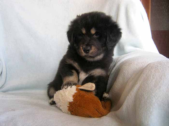 Das ist GUMMEL... GUMMEL ist ein komplett scharzer Rüde mit dem "Touch of Buddha" - einem kleinen weißen Punkt auf der Brust... Sein Name ist Quan Yin`s Andamu - die Freude der Erleuchteten...